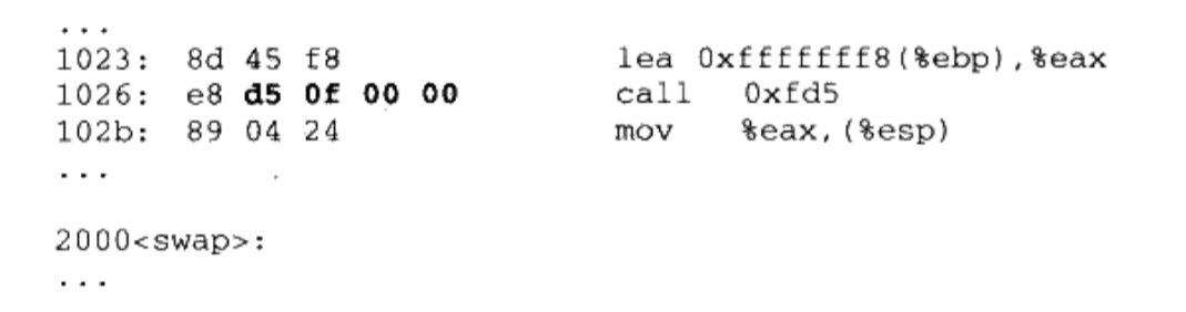 这条相对位移调用指令调用的地址是该指令下一条指令的起始地址加上偏移量,即:0x102b+0xFD5=0x2000,刚好是swap函数的地址。